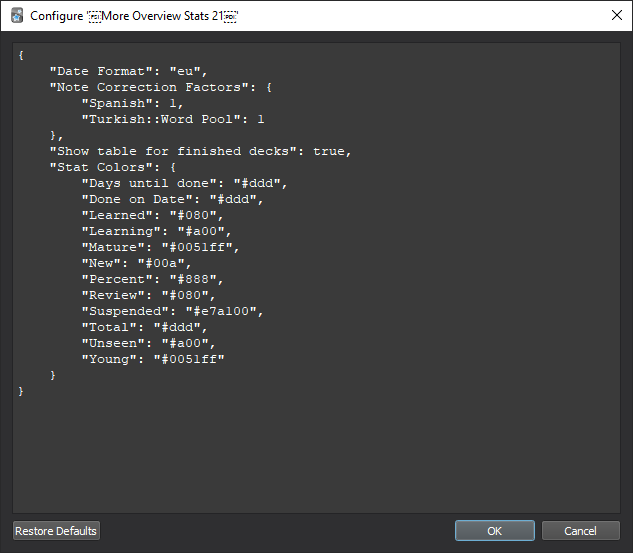 If you want the add-on to display the number of notes in a deck, instead of the number of cards, you can add the line: “note_correction_factors”: {} to the config.json. You then put the beginning of the deck name (including all parent decks) and the number of different notes. In the example below, we have a deck named ‘Word Pool’ within the deck ‘Turkish’. If this deck were to contain 3 different note types i.e., ‘Recognition’, ‘Production’, ‘Listening’, but we are only interested in how many unique words of this deck we know, we can change the factor to 3 down below. A deck with 500 words and 3 note types would have 1500 cards, changing the factor below to 3 makes the add-on display counts in relation to the 500 words. “Note Correction Factors”: { “Spanish”: 1, “Turkish::Word Pool”: 3 }