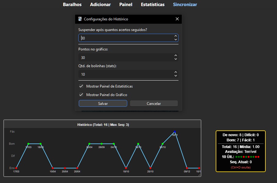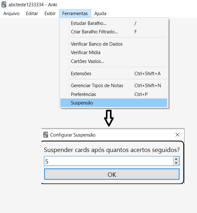 Adicionado menu para suspender cartoes certos seguidos em Ferramentas > Suspensão Da mesma forma que existe o sanguessuga, agora vc pode suspender os cards que vc mais acerta sequencialmente Valor padrão é 20, ou seja, apos acertar o mesmo cartao 20 vezes seguidas, automaticamente suspende o cartao, Vc pode modificar isso manualmente em ferramentas e suspensão