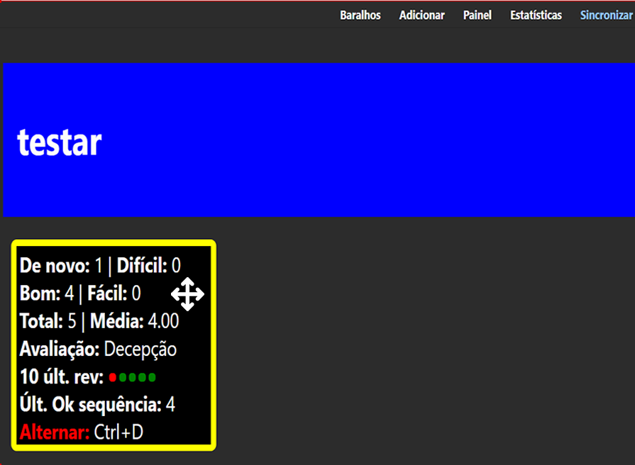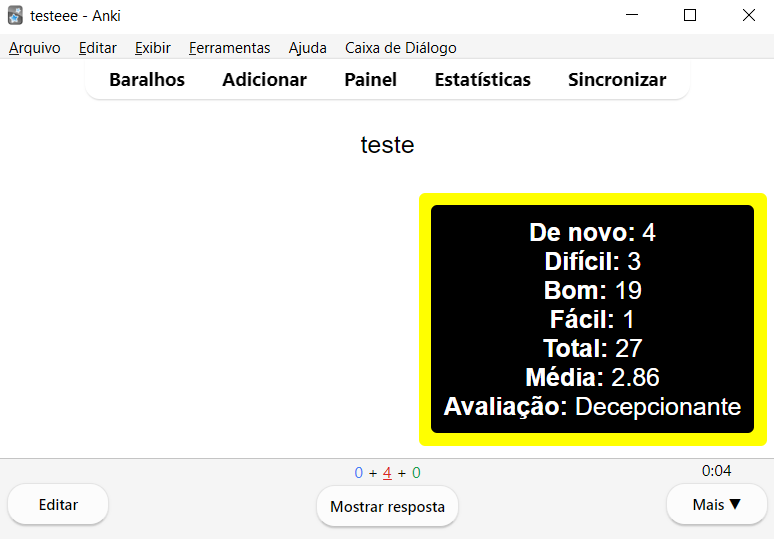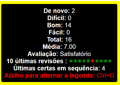 Este addon mostra a quantidade de cliques dos cartoes em de novo (1), dificil (2), bom (3) e facil (4) Media = (bom + facil) / (de novo + dificil) Total de vezes que fez o cartao Quando o card é novo tem que acertar pelo menos 8 vezes o mesmo cartao pra chegar ao nivel otimo, mesmo que não erre ele nenhuma vez antes Avaliações: Terrivel <= 1, Pessimo <= 2, Decepcionante <= 4, Insatisfatorio <= 5, Razoavel <= 5.9, Satisfatorio <= 7, Otimo <= 10 e Excelente > 10 Atalho: ctrl+d pra mostrar ou nao a tela