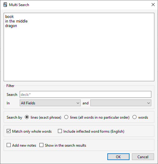 The add-on can be used to perform multiple similar searches at once, for example, by searching for cards using a list of words or some text as input.