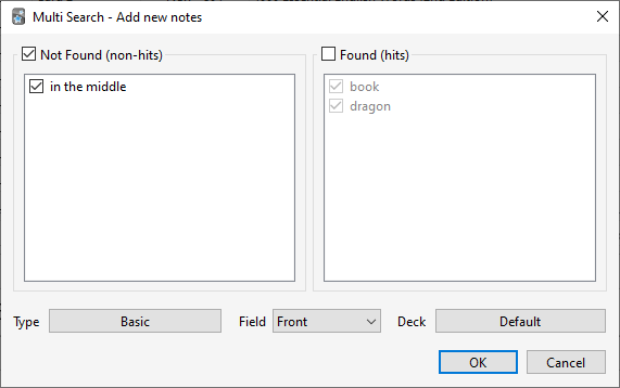 Looks like the Contact Author button just reloads this page so I will make a feature request here. It would nice to be able to show a list of words that were NOT found, that way you can see what words out of a list need to be added to Anki