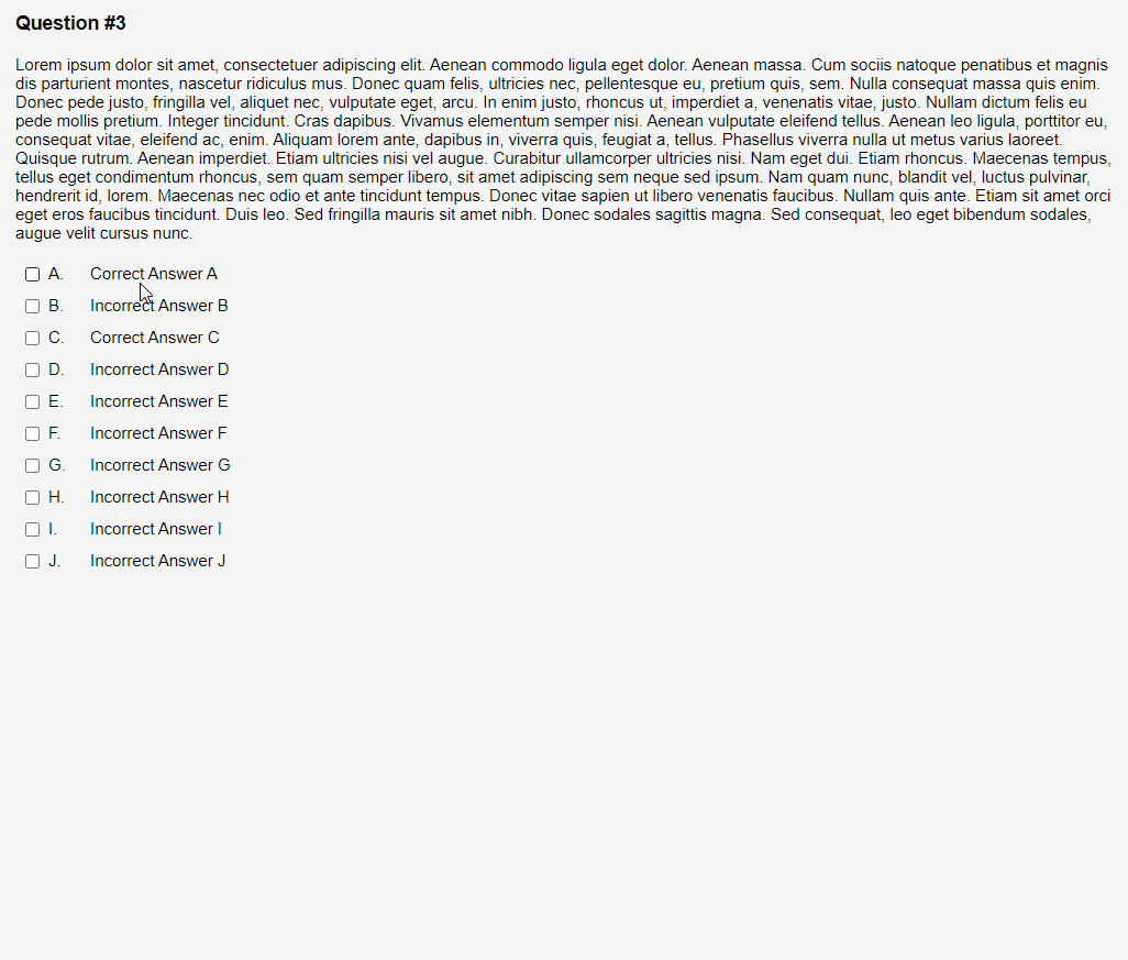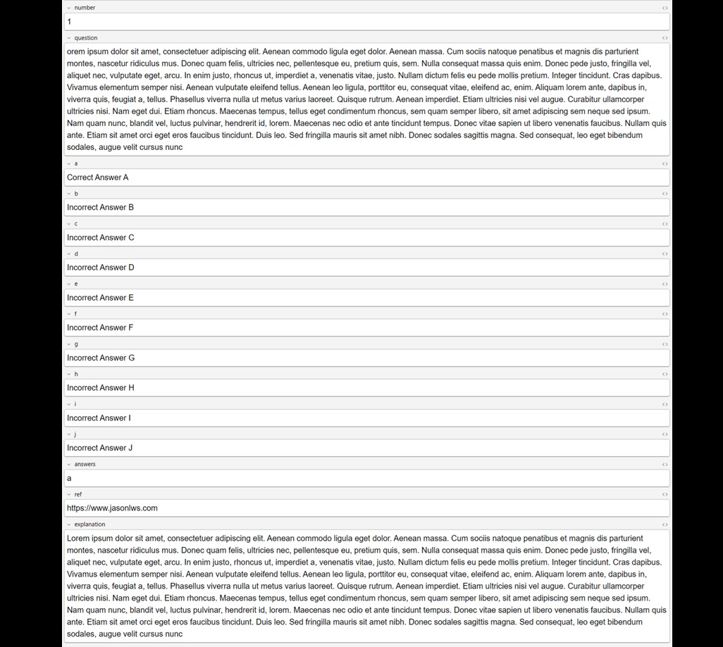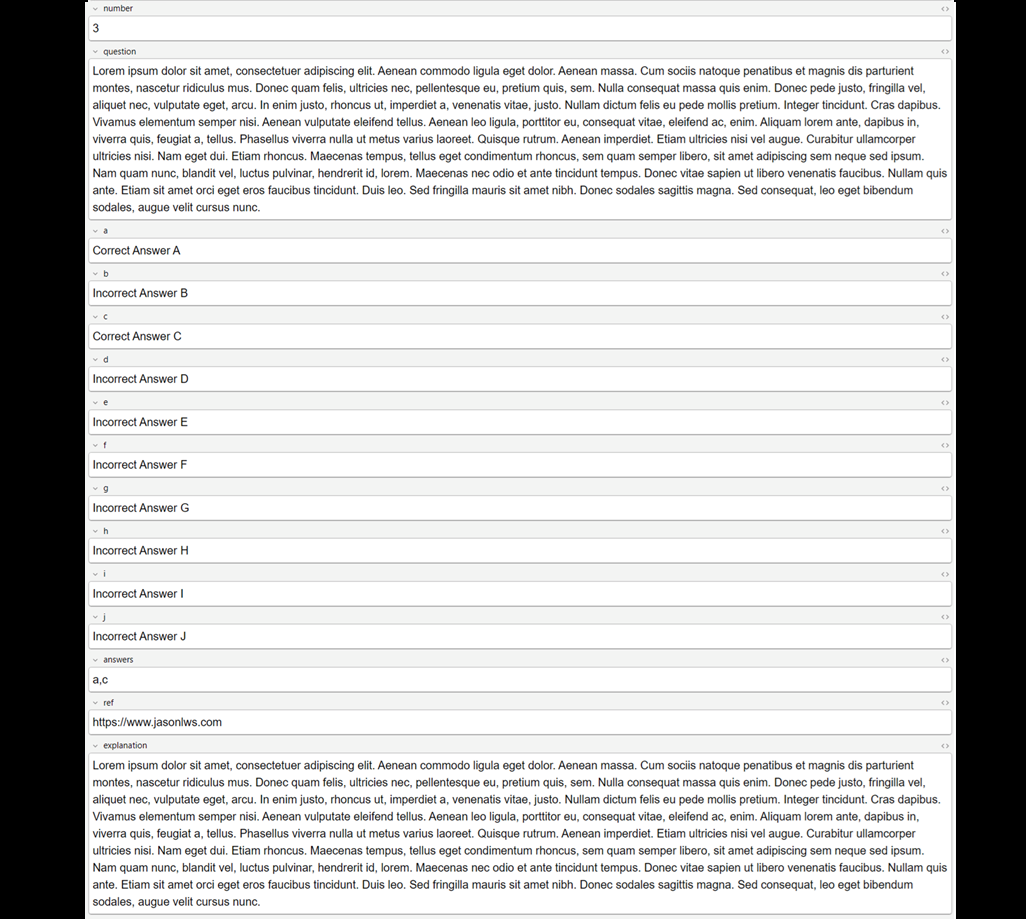 Radio Format Checkbox Format Shuffle Enabled Fields number: Question Number question: Question a, b, c, d, e, f, g, h, i, j: The list of answers answers: Correct answers (Delimiter: commas(,)) - More than one answers show as Checkbox format, otherwise, Radio format ref: Reference explanation: Explanation Box Example - Radio Format Example - Checkbox Format Example - Limit The Number of Choice You may leave the answer field empty to hide the choice. Configuration How?