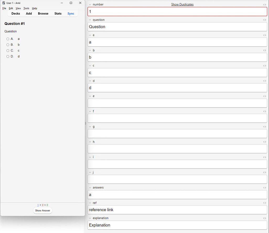 Great! One question, though — why make ‘question number’ a mandatory field? I’m asking because if someone wants to mix the MCT card with other flashcards in a deck, numbering might not be relevant or make much sense. Comment from author Thank you very much. Yup, you are right. I will include this update in upcoming release. In the meantime, please allow for duplicates first.