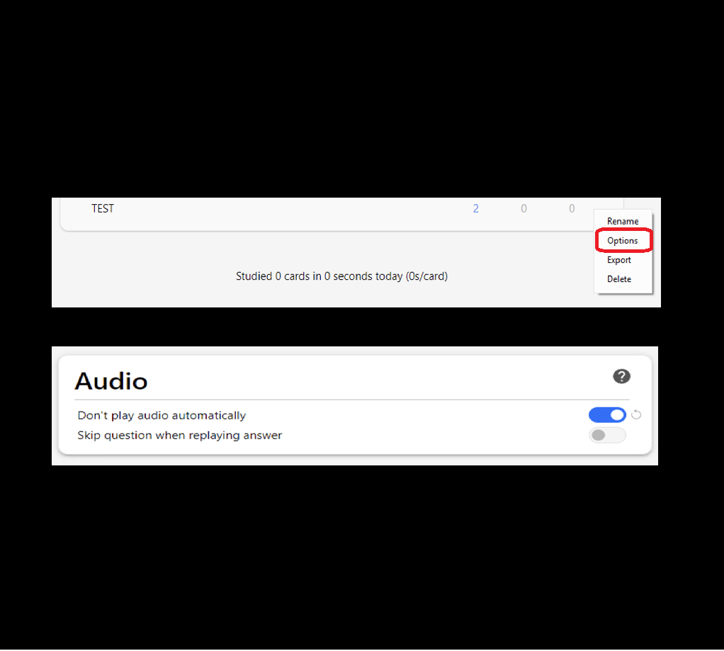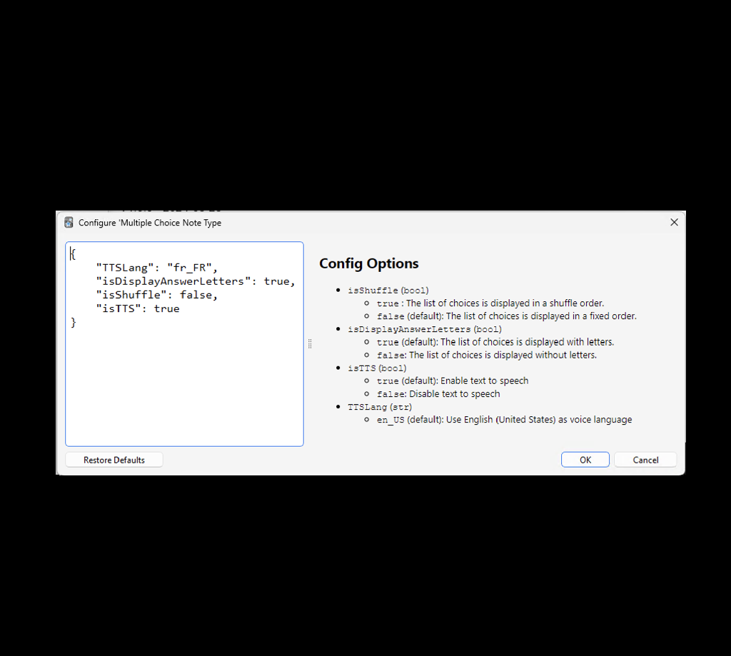 Change the order of the list of answers. Default - The list of choices is displayed in a fixed order. ( Chnage isShuffle value to false ) The list of choices is displayed in a shuffle order. ( Chnage isShuffle value to true ) Change the display of letters of answers. Default - The list of choices is displayed with letters. ( Chnage isDisplayAnswerLetters value to true ) The list of choices is displayed without letters. ( Chnage isDisplayAnswerLetters value to false ) Enable / Disable text to speech. Default - Enable text to speech. ( Chnage isTTS value to true ) Disable text to speech. ( Chnage isTTS value to false ) Change voice language of text to speech. Default - Use English (United States) as voice language. ( Chnage TTSLang value to en_US ) Language Code Example: https://learn.microsoft.com/en-us/linkedin/shared/references/reference-tables/language-codes How to set “Don’t play audio automatically” In the deck options, Enable Don’t play audio automatically under Audio section. Changelog