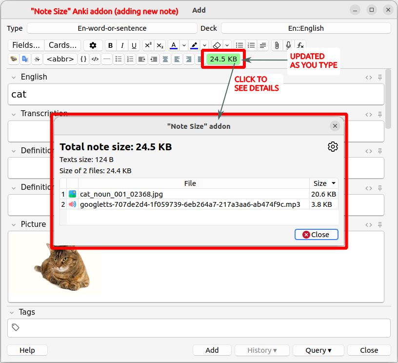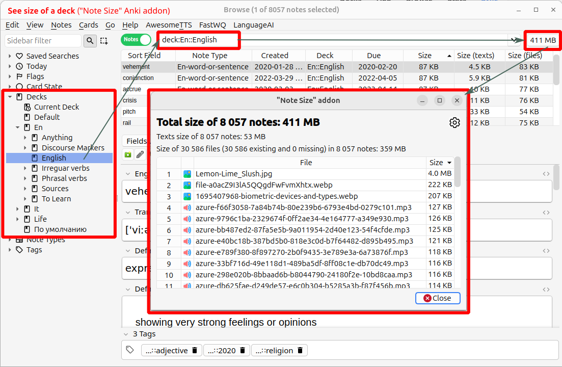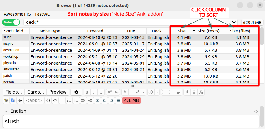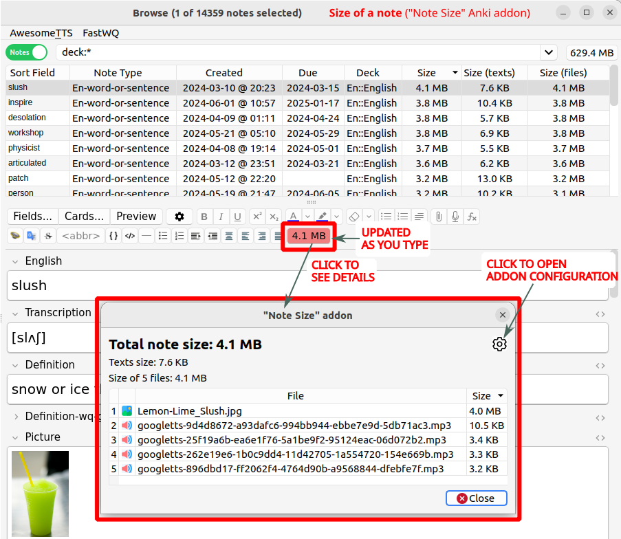 - Kết hợp siêu đỉnh cùng AJT Media Converter: Nhiều thành viên trên AnkiWeb gọi đây là sự kết hợp hoàn hảo. Bạn dùng Note Size để kiểm tra, khoanh vùng thẻ nặng, sau đó dùng addon