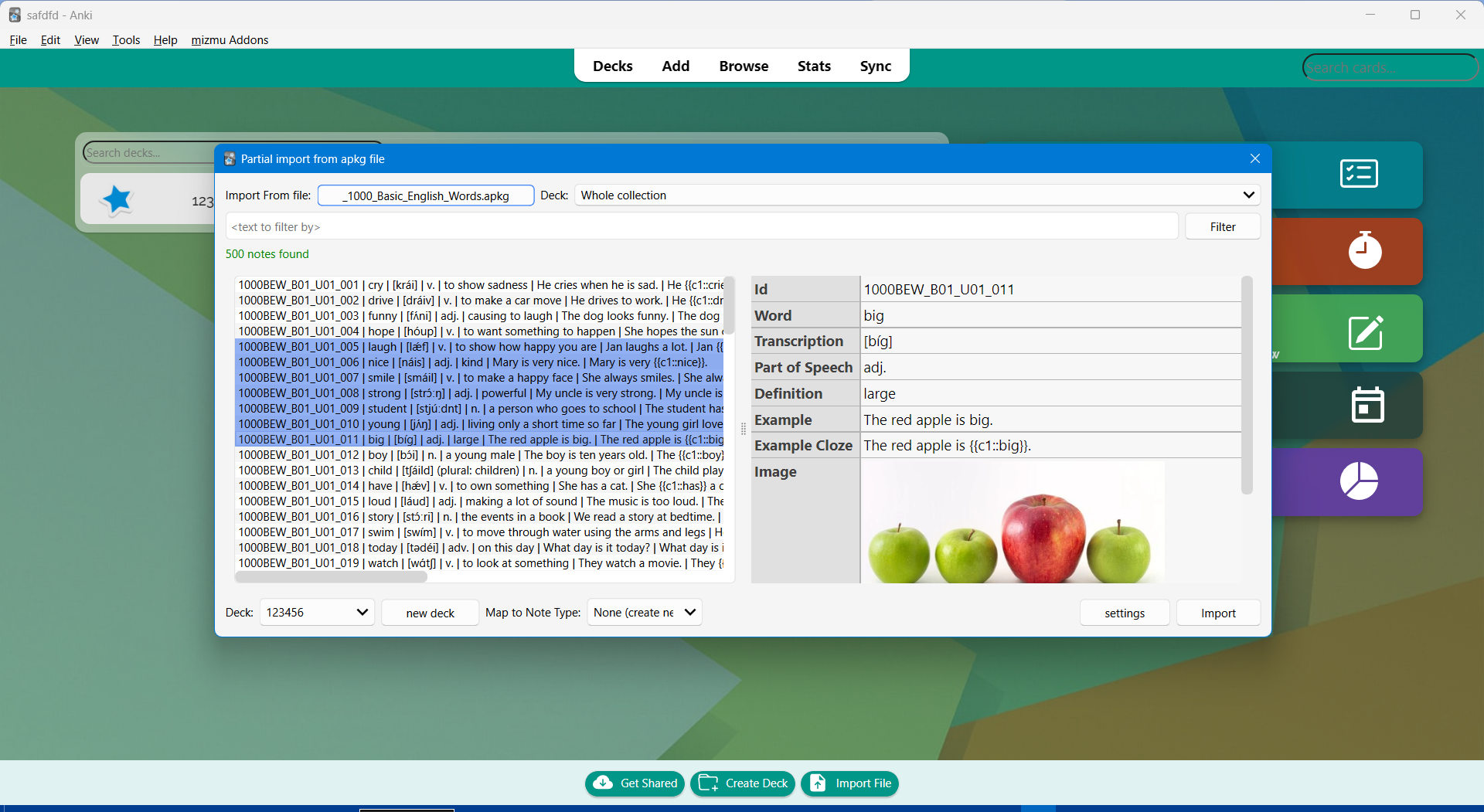 This addon allows partial import of apkk file using card selection window and live view. Most of this addon is copied from the “Cross Profile Search and Import 2.0” addon and Anki’s source code. Note: for now the cards duplicate check does not work!