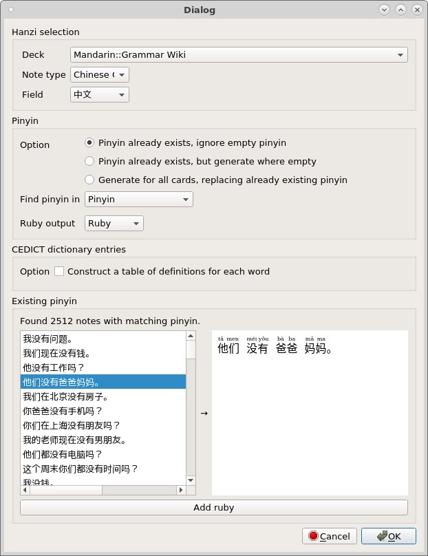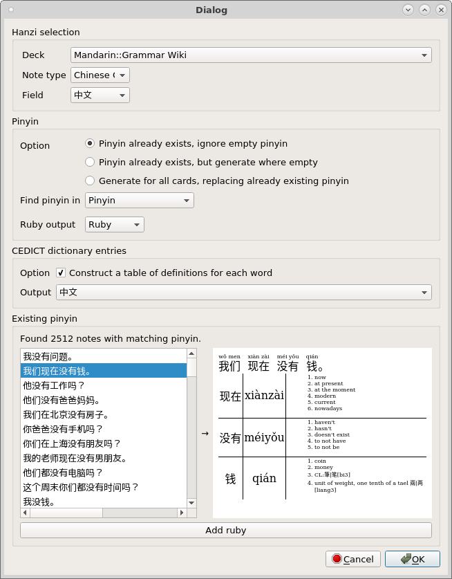 Notes Although ruby generation works for all Pinyin options, when Pinyin is generated where there is none currently existing, the Pinyin will not be saved to the note, despite the option Pinyin output. I have some pretty bare-bones CSS for the definitions table, which I’ll publish soon. I include spacing between Hanzi in the ruby.If you want to preserve the spacing of the original Hanzi, I’ll add that as another option in the addon window.