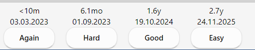 This addon displays above each rating button the estimated date when that card will appear again if you click that button.