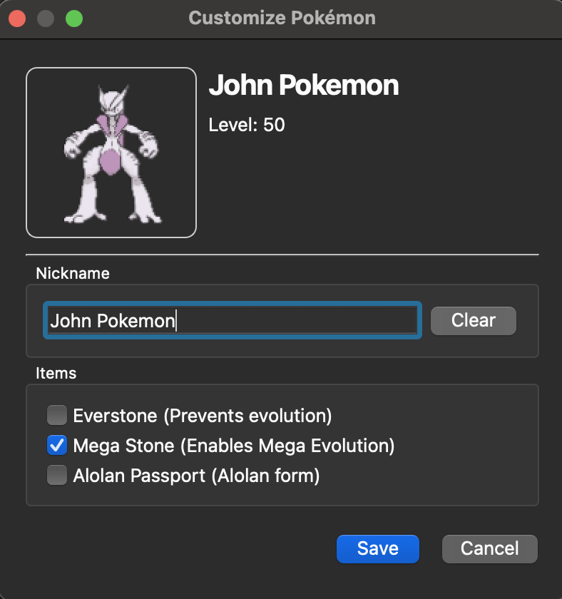 You can add a megastone, everstone, and alolan passport to each Pokemon through the customization menu!