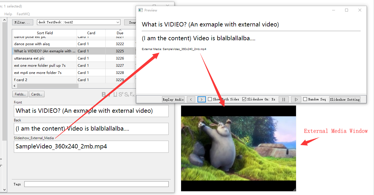 Make Anki preview window as slideshow. For each card, it also introduce a media window to show external media files(not stored in Anki DB) like mp4, mp3, jpg, etc. External media window can be disabled, of course.
