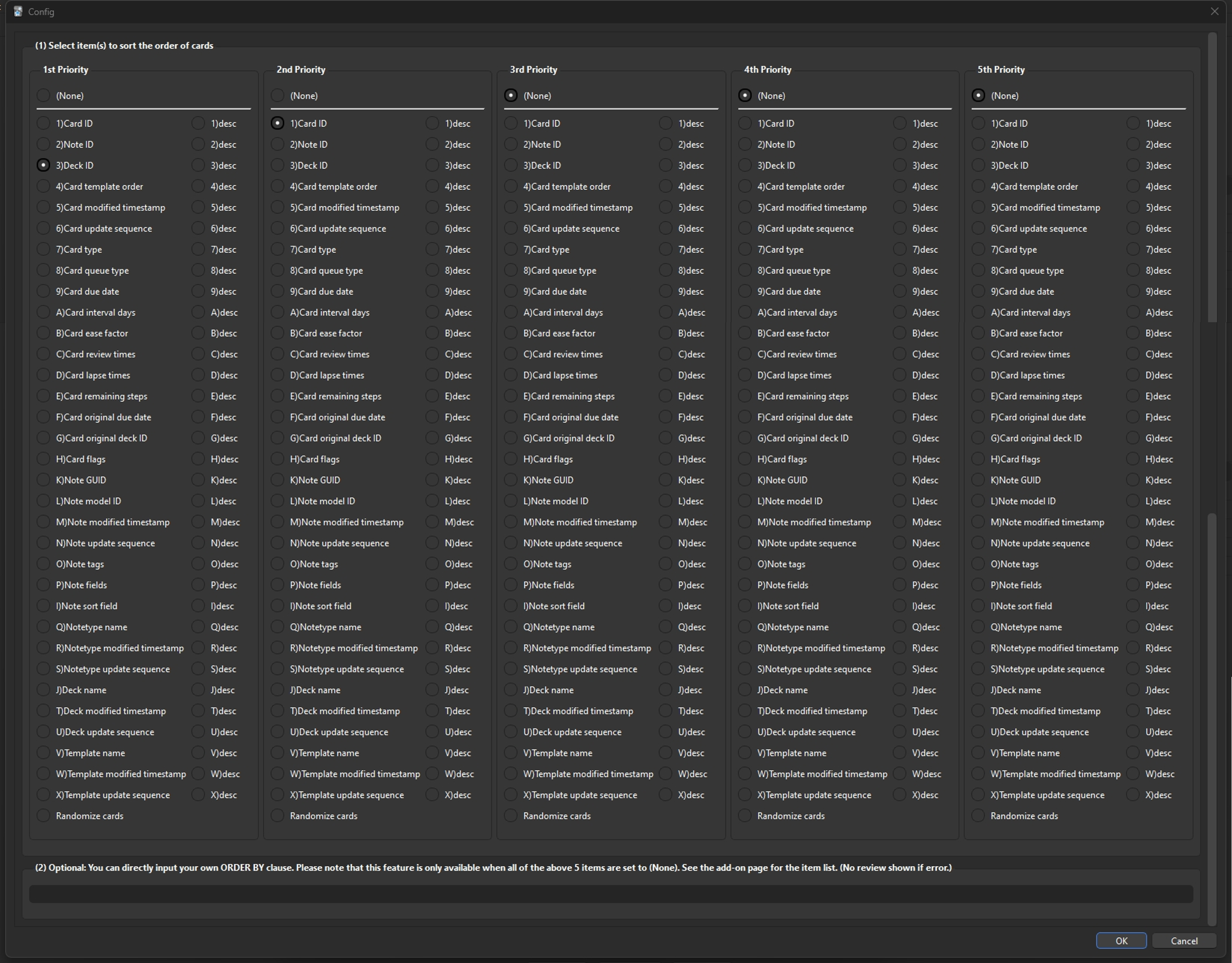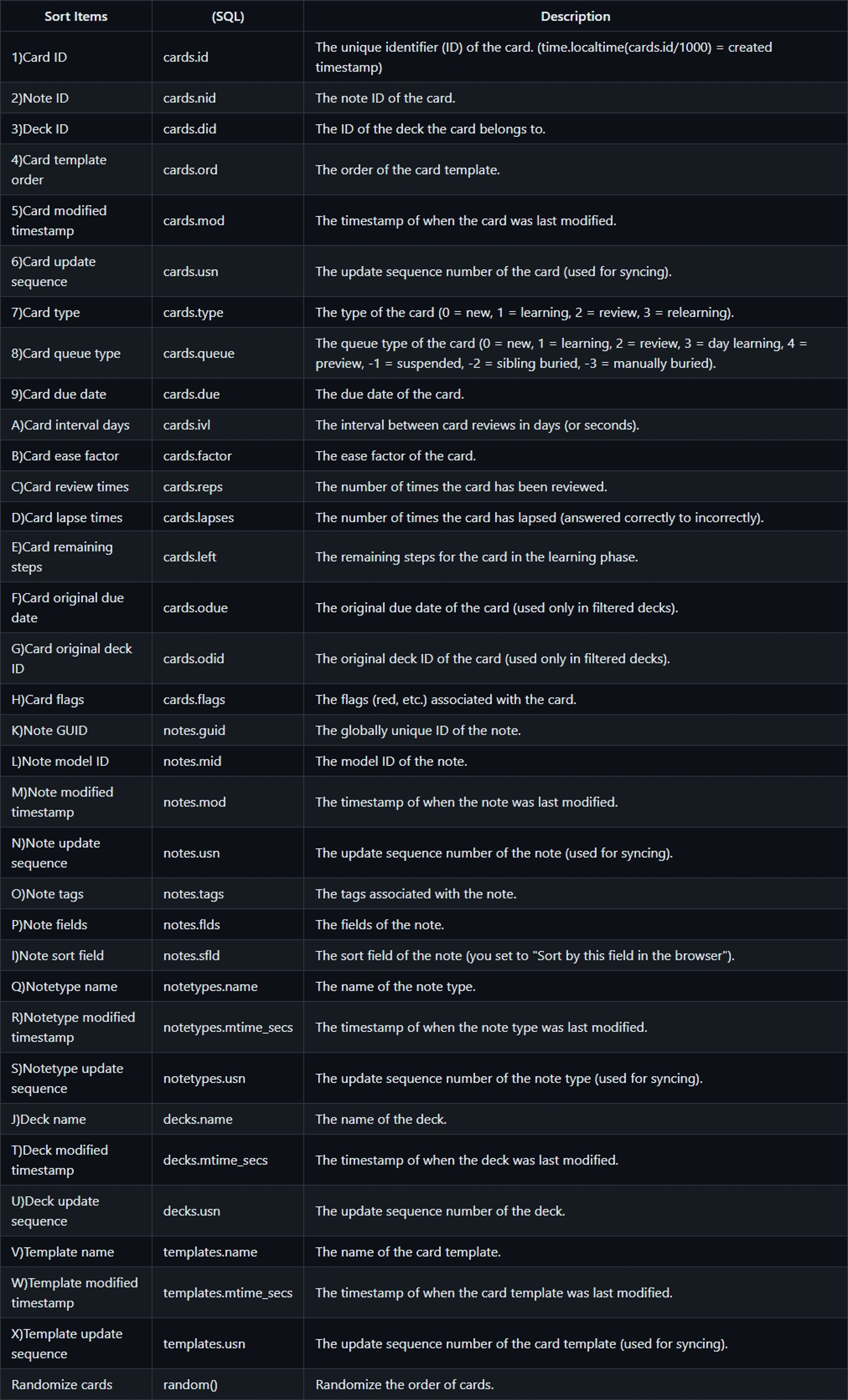 Possibly useful for those who want to learn in a specific sequence. Please note that this feature is only available with the V2 Scheduler (it will not work with the V3 Scheduler). Make sure the V3 Scheduler is disabled in Anki’s Preferences. Config To sort cards by their Deck ID and Card ID for example, set the configuration as the following image: Descending order if “desc” selected. Higher priority item(s) first. FYI: The Anki’s default is “cards.due, random()”. Usage Examples Example 1: Order by card creation date Select: Card ID (The older creation the smaller number.) Example 2: Completely random order Select: Randomize cards Example 3: Order by deck name firstly, and note content secondly Select: (1st) Deck name (2nd) Note sort field (This setting allows management by manually entered serial numbers.) Note When the V2 scheduler is phased out of Anki, this addon will become obsolete. The V3 scheduler has its back-end system written in Rust, making it difficult to perform the same operations as with the V2 scheduler. Changelog 2025-04-20 Changed the maximum supported Anki version 2.1.66 that still allows the use of the V2 scheduler 2023-07-28 Added config window (after this addon is updated, please restart Anki.) 2023-07-29 Changed supported Anki versions to 2.1.50+ 2023-08-10 Changed config window’s layout for usability improvement 2023-08-15 Added 3 sort items: Note type name, Note sort field, Deck name Added error handling 2023-08-20 Added 14 sort items: Card flags, Note GUID, Note model ID, Note modified timestamp, Note update sequence, Note tags, Note fields, Note sort field, Notetype modified timestamp, Notetype update sequence, Deck modified timestamp, Deck update sequence, Template name, Template modified timestamp, Template update sequence (Reference: https://github.com/ankidroid/Anki-Android/wiki/Database-Structure) Sort items (For the optional direct input to be used as ORDER BY clause, please use the items in the middle column. For example, ‘cards.did, random()‘)