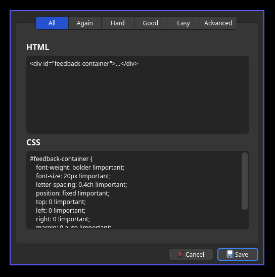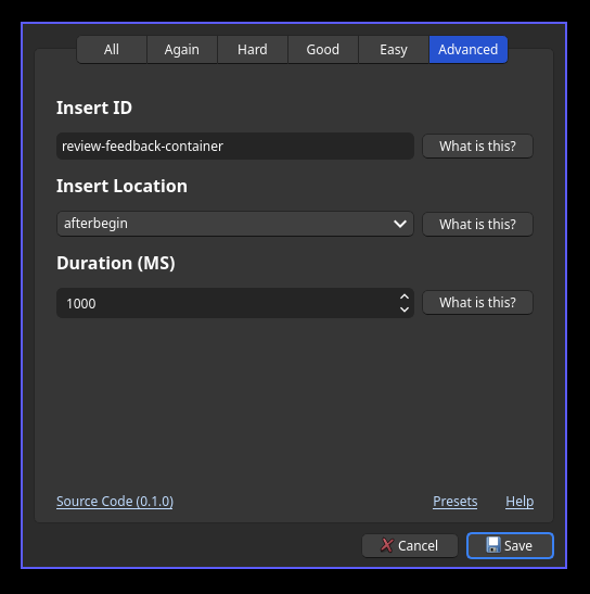 See presets.md for alternative presets. The default preset is designed to emulate AnkiDroid’s feedback behavior.