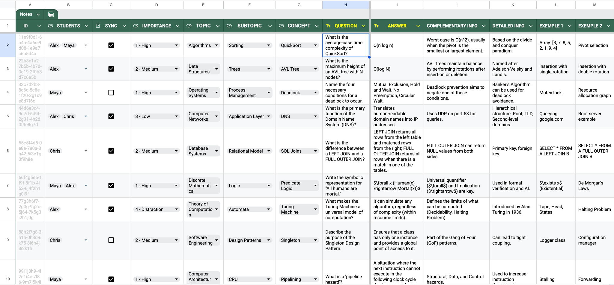 ID: Unique identifier for updates. | Q101 STUDENTS: List os students who wants to learn the information. | Igor, Isabelle, Jack SYNC: Mark the checkbox to sync this row. | TRUE QUESTION: The front of your flashcard. | Capital of France? ANSWER: The back of your flashcard. | Paris