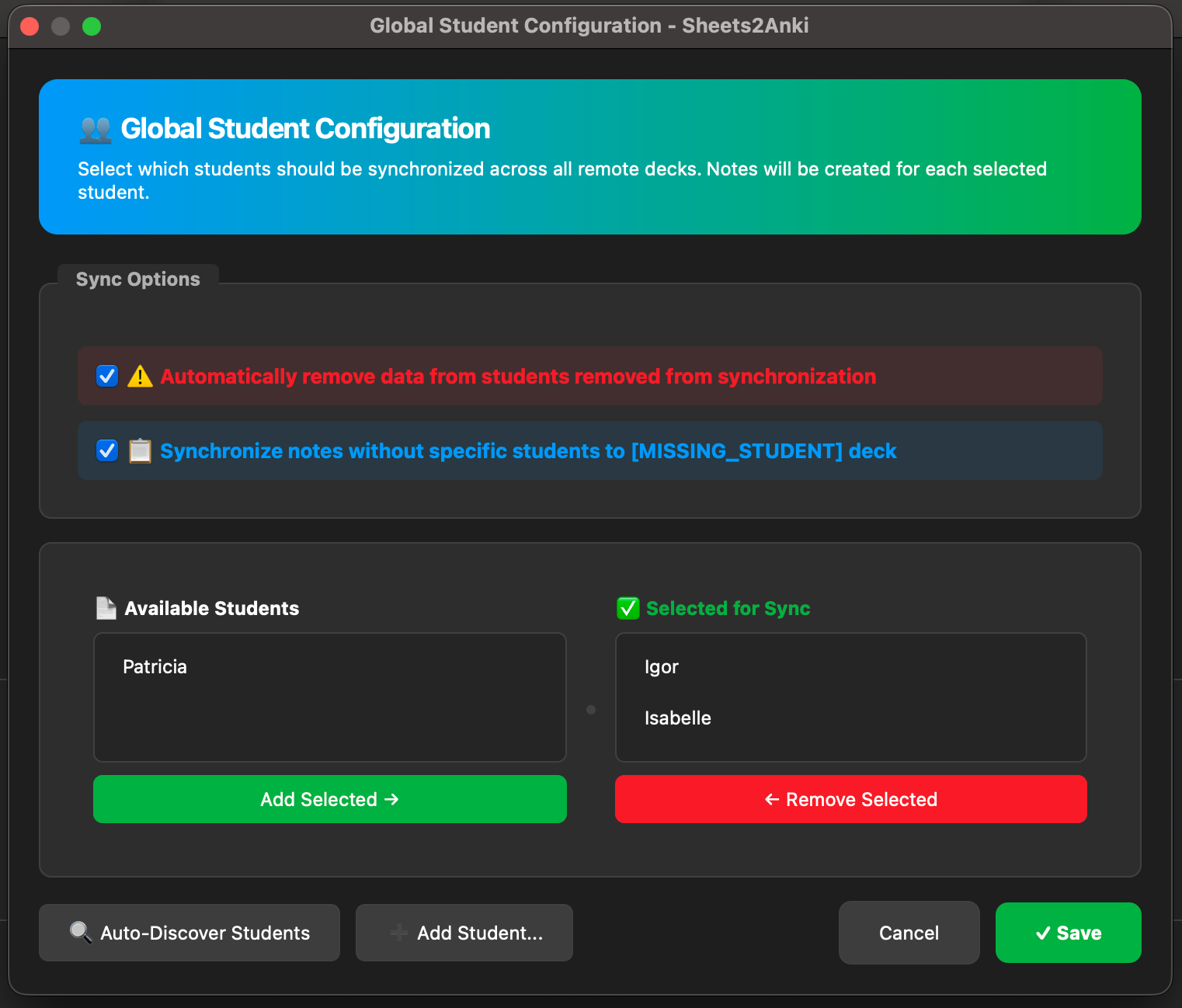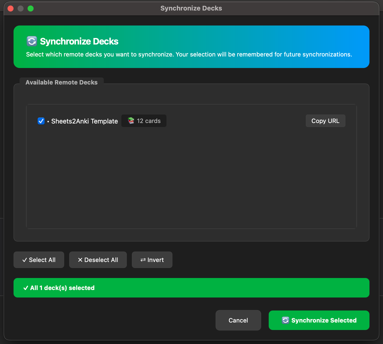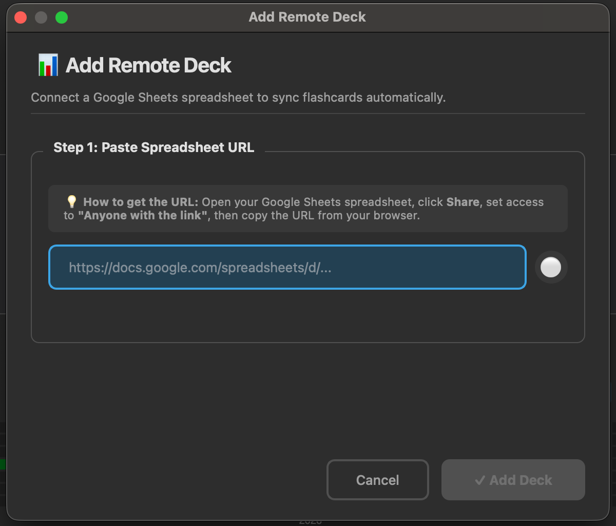 🚀 Key Features Bulk Creation: Write hundreds of cards as fast as you can type. 🤖 AI Integration: Use Gemini, Claude, or OpenAI to get explanations directly in your cards. Collaboration: Work with friends or students on the same spreadsheet. Smart Sync: Cards are automatically organized into subdecks (Topic > Subtopic). Rich Media: Supports HTML, Images, and Videos (YouTube/Vimeo). Cloze Support: Automatically detects {{c1::cloze}} cards. ⚡ Quick Start Get the Template: Click here to copy the Official Google Sheet Template. Connect: In Sheets: Share -> Anyone with the link can view -> Copy Link. In Anki: Tools -> Sheets2Anki -> Add Remote Deck -> Paste Link. Sync: Press Ctrl+Shift+S to bring your cards into Anki. 📋 How it Works