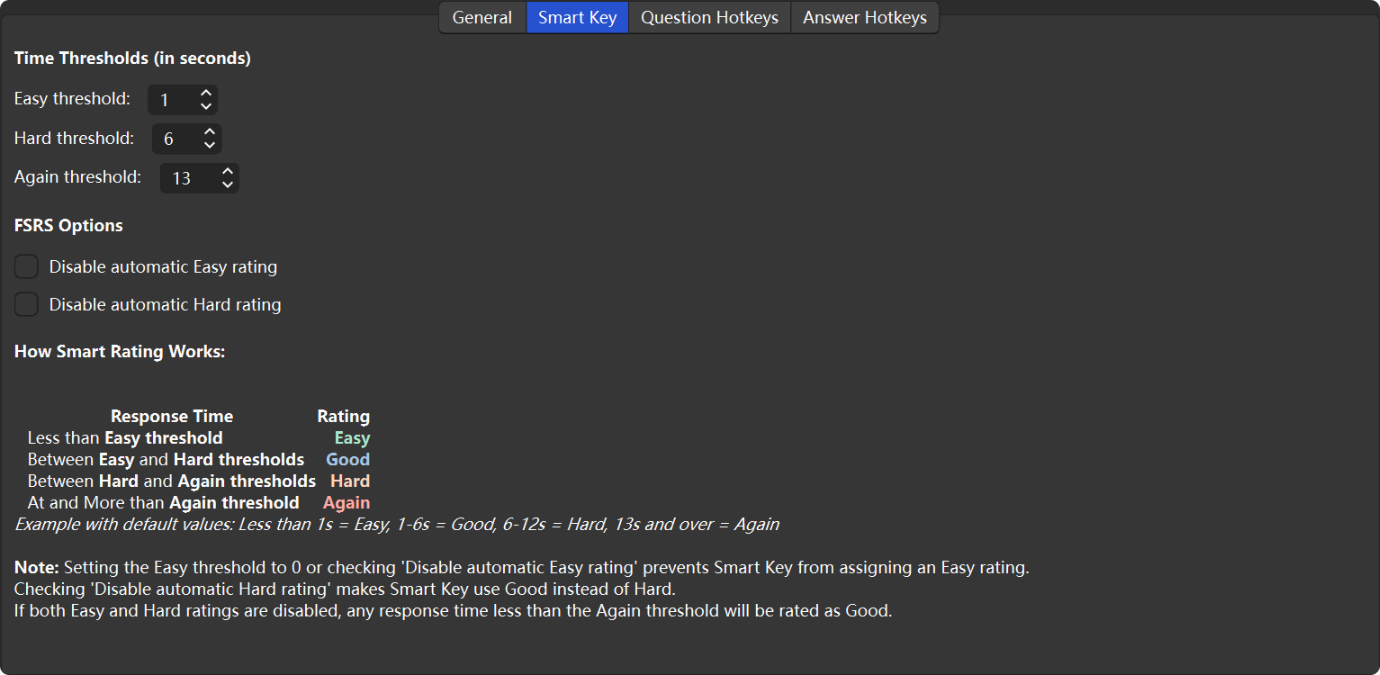 This plugin basically merged the functionality of Pass/Fail Review: Automatic difficulty rating based on answer time (beta ver.) by doubleworker, with Review Hotmouse by BlueGreenMagick. So now it supports time-based automatic scoring. The smart scoring is enabled by default. I created this add-on to procrastinate before reviewing 700 piled-up cards :(