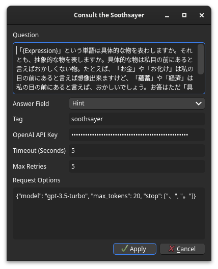 For those looking for a very good alternative to integrate AI into Anki, with ChatGPT, Google Gemini and Bing AI, you can also use this new addon: https://ankiweb.net/shared/info/1428126516