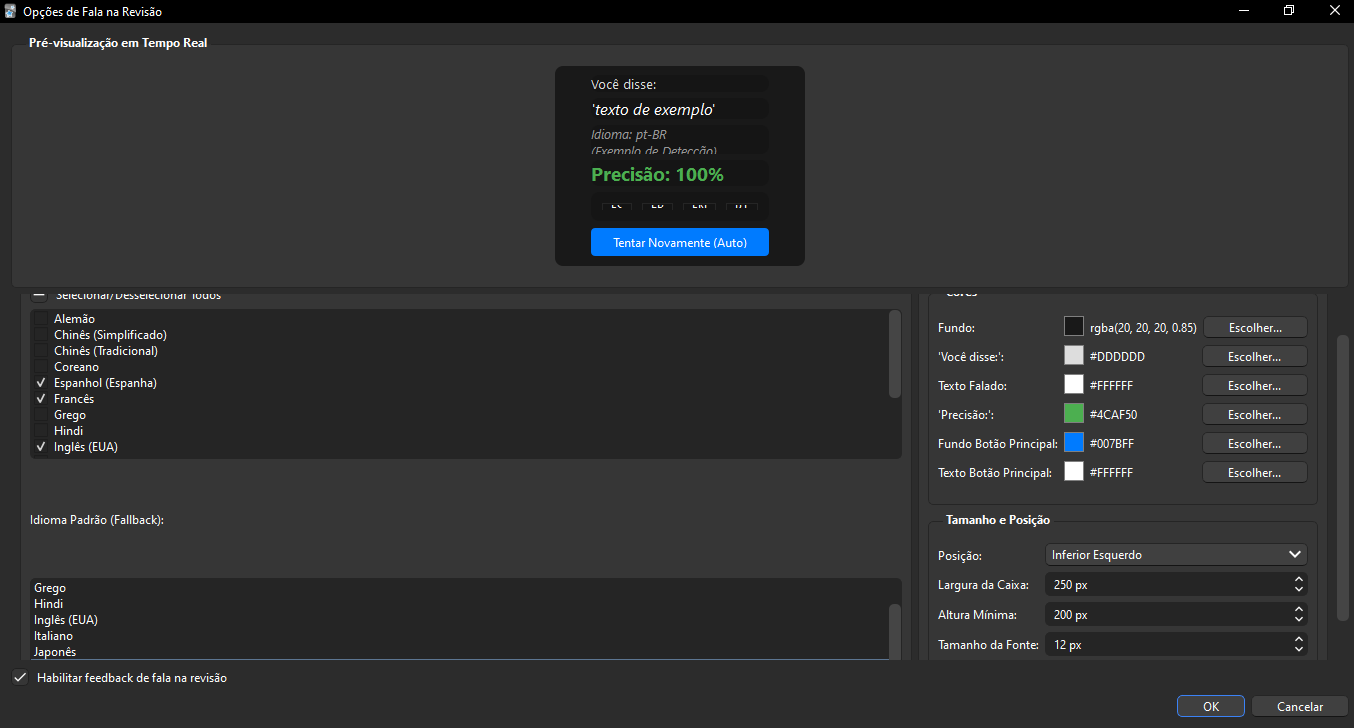 No exemplo abaixo, na tela de frente da revisão eu falei “testando” no microfone e então a precisão foi 100% pois esta escrito “testando” no campo Verso que é onde a comparação acontece.