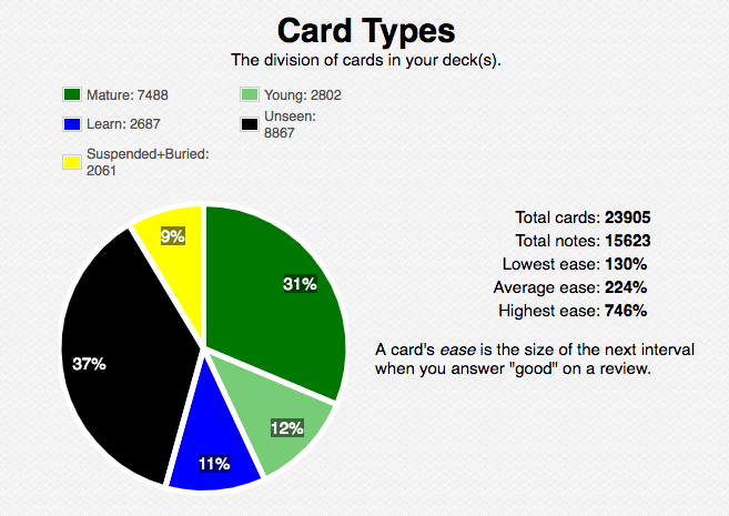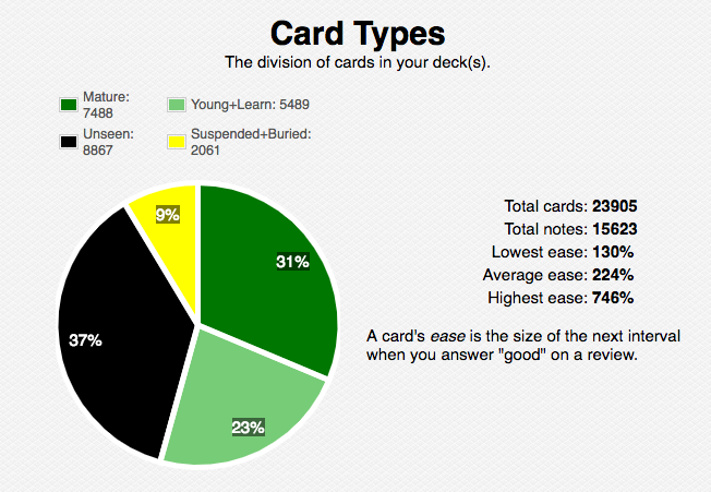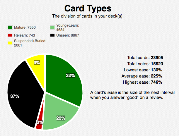 The stock version of Anki includes a pie chart at the end of the statistics overview screen, with the deck/collection divided into ‘New’, ‘Suspended+Buried’, ‘Young+Learning’, and ‘Mature’ sections.