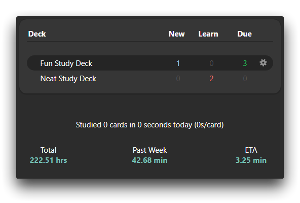 Theo dõi sát sao lượng thời gian ôn luyện mỗi ngày luôn là một trong những cách thức giữ lửa động lực thiết thực và truyền cảm hứng nhất. Study Time Stats là một addon Anki mạnh mẽ giúp bạn chèn trực tiếp một bảng khung thống kê quản lý thời gian học tập tuyệt đẹp và có khả năng tuỳ biến thay đổi cực cao ngay ra ngoài cửa sổ màn hình trang chủ (Main window) của ứng dụng học ngôn ngữ Anki.