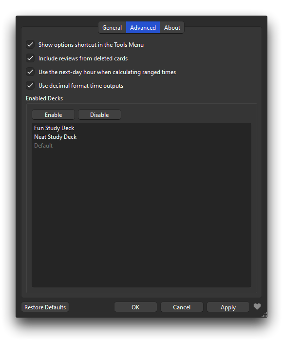 - Cho phép người sử dụng thao tác linh hoạt thiết lập các quy tắc bộ lọc tùy chọn để loại trừ đi bất kì bộ thẻ cấu trúc (Exclude decks) nào mà bạn cảm thấy không muốn chúng dính líu bị đếm tính gộp quét chung vào mảng tổng thời gian học.