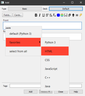 This includes high-utility improvements over the add-on from which this was forked—dear author, you are selling yourself short here! I prefer this one over the more “popular” Highlight Code add-on because it includes advanced customizability (deck-specific default language, favorite languages for quick selection, and more), full support for Pygments (necessary for cloze deletion support), and a simpler highlighting UI.
