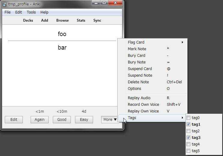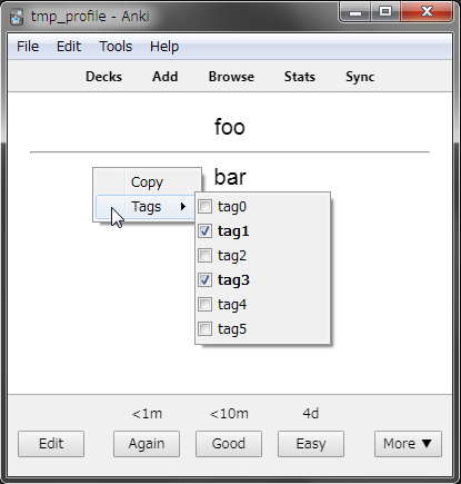 Review screen Popup menu of the “More” button at the bottom of the review screen Middle area of editor except for the area labelled “Tags” Bottom right area of browser except for the area labelled “Tags”