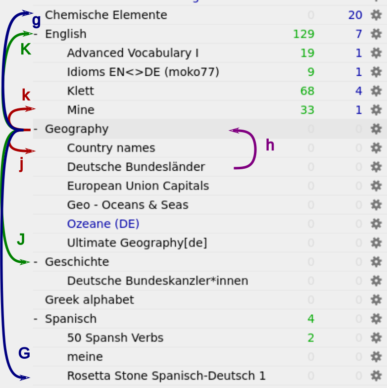 • j one deck down • J one deck down, on the current level in the deck tree • k one deck up • K one deck up, on the current level • h got to parent level (one level higher) • g first deck • G last deck • o open selected deck • + or - to toggle between collapsed state • Return study selected deck