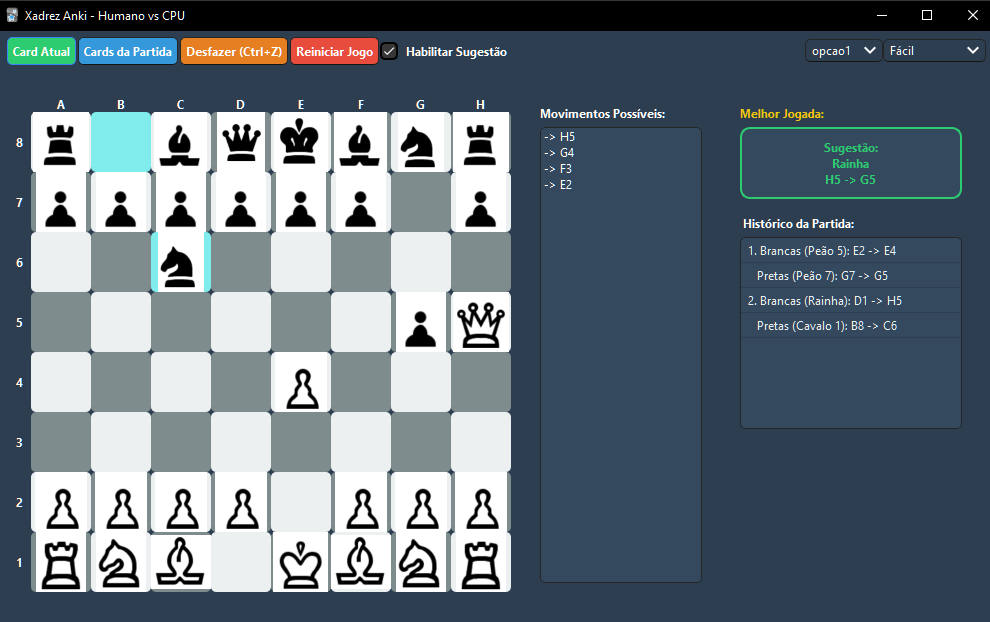 Sugestão de jogada: Se você ativar essa opção, ele mostra um painel dizendo qual seria o melhor movimento para aquela situação. Aviso de Perigo: Ele avisa visualmente quando o seu Rei (ou o do adversário) está em perigo (Xeque). Histórico: Ele anota todas as jogadas feitas na lateral da tela para você não se perder.