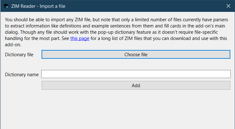 Settings You can configure some settings of the add-on from Tools > ZIM Reader > Settings. Currently only the pop-up dictionary’s settings are configurable here. For the parser option, if your chosen dictionary file doesn’t have a dedicated parser, you can simply choose the “Default” parser. Parsers here are currently only useful to convert a word to its base form and search for that instead using language-specific rules if the exact word doesn’t have a page in the dictionary.