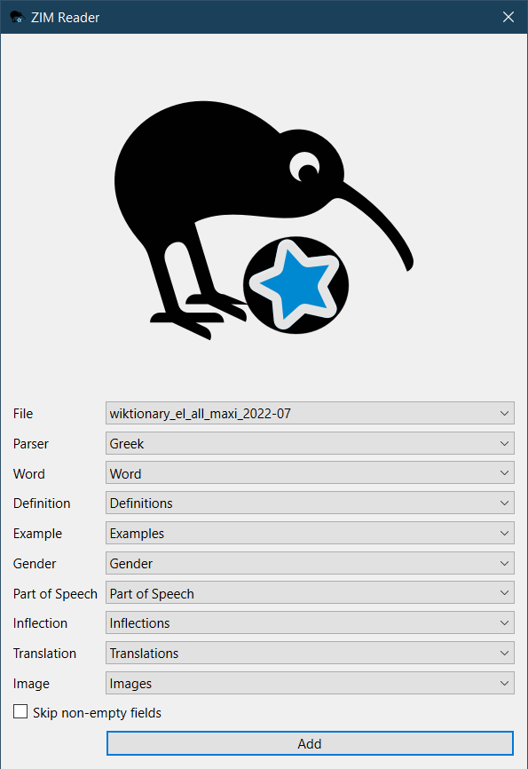 File: The imported ZIM file you want to extract info from. Parser: For the add-on to understand how to extract data from the chosen file, you need to tell it what “parser” it should use to do that. Only a limited number of ZIM files for a couple of languages currently have parsers. Word: The field where the word you want to query exists. The other options decide to which field each kind of supported info goes.