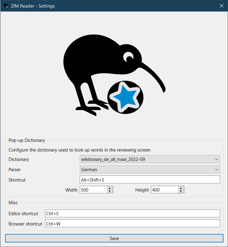 Pop-up dictionary There is also a feature to look up words in the reviewing screen in imported ZIM files. Unlike the “fill-in” feature, this should work on any imported ZIM file without the need for a special parser. If you select any word and press “Alt+Shift+S”, a pop-up should be shown with the page of the selected word if found. You can configure the ZIM file used for the pop-up feature and some other settings from the Settings dialog.