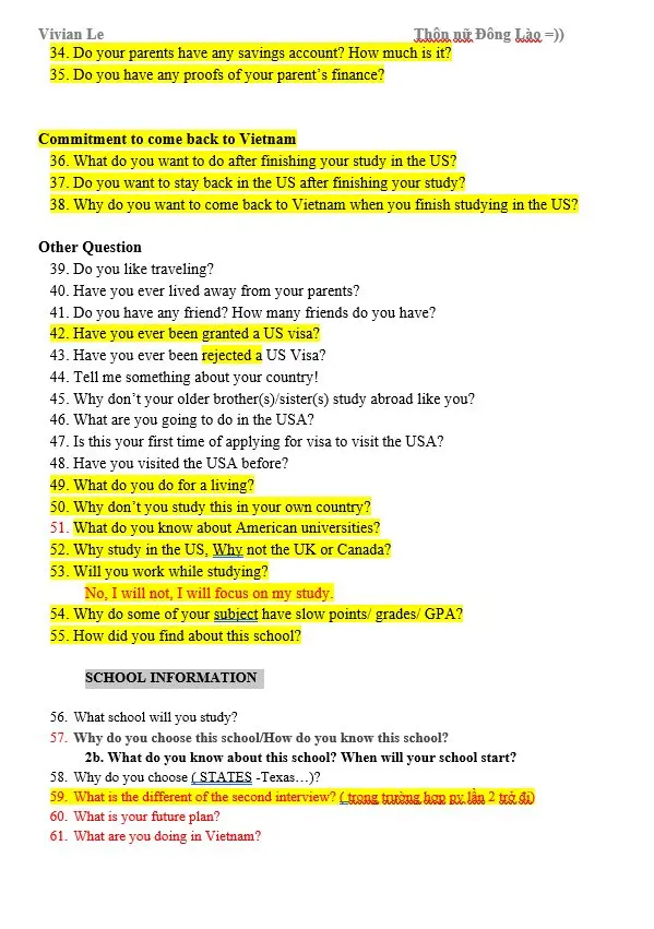 Bộ câu hỏi phỏng vấn visa Mỹ này được mình tổng hợp kỹ lưỡng từ nhiều nguồn đáng tin cậy, dựa trên kinh nghiệm thực chiến của chính bản thân và nhiều người đã từng trượt phỏng vấn lần đầu nhưng đậu ngay ở lần thứ hai sau khi luyện tập với bộ câu hỏi này.